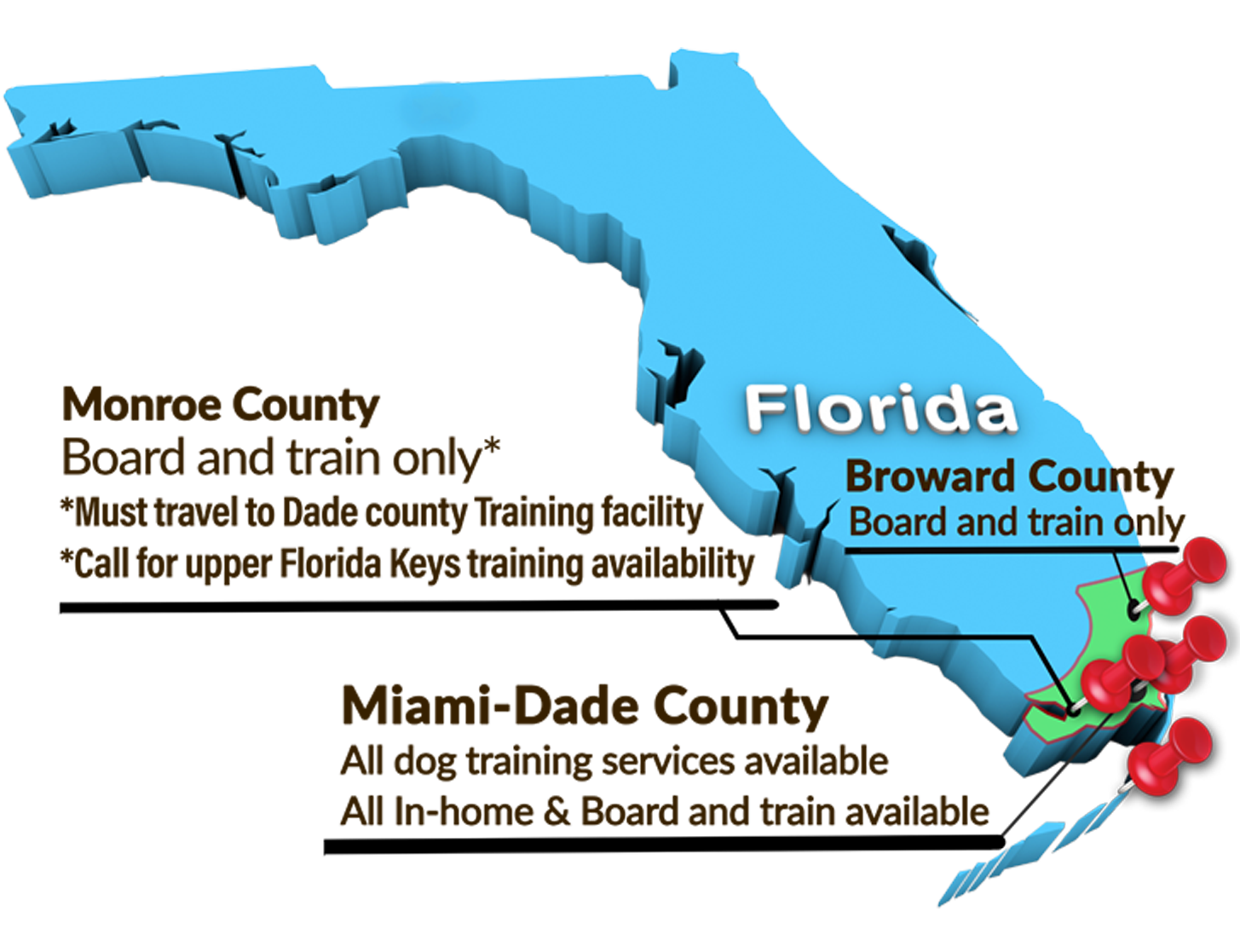 Serving in home training programs throughout Miami-Dade County and the upper keys. Puppy training, intermediate and advanced in-home, executive in-home training, in-home protection and service dog training all have coverage throughout Miami-Dade County. Boarding and training extends throughout Miami-Dade and Broward counties and the surrounding areas.